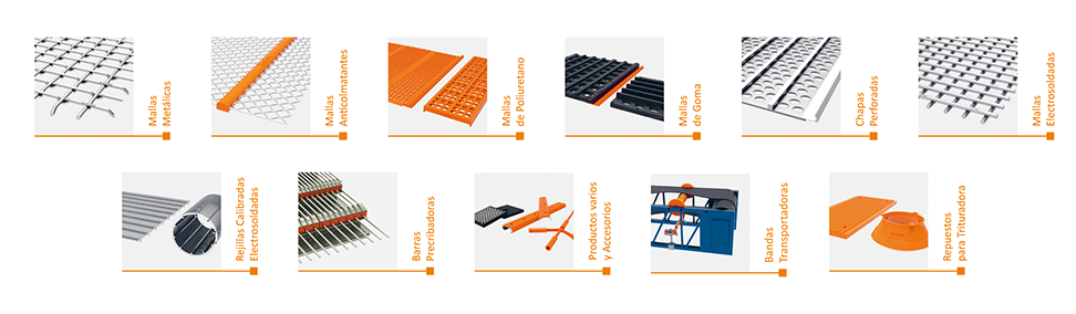 Nuestra gama incluye las siguientes superficies cribantes: Metálicas de acero (AR e Inox), Anticolmatantes (autolimpiantes), en Poliuretano de tensión y modulares (incluyendo nuestro sistema patentado TN), de Goma en tensión y autoportantes, Electrosoldadas, Chapas Perforadas, Rejillas Calibradas Electrosoldadas, Barras Precribadoras, Productos Varios y Accesorios, Cintas transportadoras y Repuestos para Trituradoras.